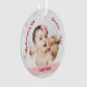 Trendy, elegante e fofo personalizou o Primeiro Ornament de Natal para uma nova menina com uma moldura branca com flocos de neve e estrelas que tem uma abertura redonda para uma foto horizontal personalizada, e uma banda rosa curva em cada lado na qual aparece o nome ou nomes da menina e sua data de nascimento em uma letra/tipografia elegante. Esta design inclui na frente as palavras "Minha primeira feliz pequeno Natal 202X"