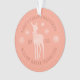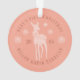 O adorno rosa pincelado moderno para o primeiro Natal do bebê personaliza com o nome do bebê, ano, veado com um arco, flocos de neve e letras curvas em serif.