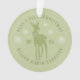 O ornamento verde empoeirado moderno para o primeiro Natal do bebê personaliza com o nome do bebê, ano, veado com um arco, flocos de neve e letras curvas em letra serif.