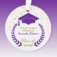 presente de ornamento de graduação para aquele segundo grau especial ou formando universitário com texto frontal e traseiro personalizado. Apresenta a imagem de um boné de formando roxo e uma coroa de louros impressa em acrílico resistente. Acentuado com confete de ouro falso. As cores pretas, azuis e outras cores de boné também estão disponíveis neste mesmo design
