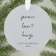 Simples, na moda, ornamento de feriado minimalista com a moderna tipografia de escrita manual informal escrita casual, citando "Peace Love & Hugs" a preto com um fundo branco simples e limpo. O nome e o ano podem ser facilmente personalizados para um toque pessoal. Um design de natal elegante, minimalista e contemporâneo para se destacar da multidão nesta temporada de festas! #natal #mínimo #ornamento