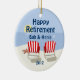 Obtenha pronto por os anos do por do sol com este design tropical que caracteriza cadeiras de praia listradas vermelhas e brancas, uma estrela do mar e o fundo da ilha. Aperfeiçoe o presente para aposentados. Texto customizável. Original de PinkInkArt!