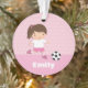 Um ornamento decorativo para uma menina que seja um fã ávido do futebol e do futebol! Características de design uns desenhos animados da menina bonito com seu cabelo amarrado em uma cauda de pônei. É vestida em um jérsei de futebol branco com listras cor-de-rosa, shorts cor-de-rosa e as botas de harmonização do futebol. Sabe sure segurar uma bola de futebol! Personalize com o nome da criança.