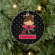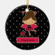 Este ornamento cerâmico redondo tem um design bonito das crianças de uma menina marrom do cabelo vestida acima como um joaninha. Há um teste padrão preto e branco dos polkadots no fundo com um joaninha na parte inferior. Gráficos pelo estúdio de Stockberry em Mygrafico