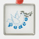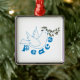 Um ornamento personalizado da paz que inclui uma pomba com um ramo de oliveira e a palavra Paz ao longo do peito da pomba, com o sinal de paz dos 60 anos.