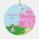Este ornamento cerâmico dado forma círculo tem um tema doce da princesa. Há uma princesa pequena bonito com o cabelo marrom que está à esquerda de seu castelo do rosa quente que está à direita. Na terra, há uns lotes de flores azuis e cor-de-rosa. Na esquerda, você pode personalizar o nome e o ano.