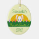 Um adorável ornamento cerâmico de dois lados do coelho de primeira Páscoa. O ornamento é redondo e apresenta um coelho bonito em um jardim de primavera com ovos de Páscoa sobre fundo de cerâmica amarelo-claro. O ornamento diz "Primeira Páscoa" em uma adorável carta verde, com áreas de modelo para você personalizá-la com o nome e o ano do seu filho. Para alterar a cor, o estilo ou o tamanho da fonte, basta clicar em 'personalizar' e essas opções também estarão disponíveis para você. Um enfeite especial para adicionar à sua árvore de feriados ou decoração de feriados de Páscoa, e é um presente de feriado excelente para amigos e familiares também! Este design de coelhinho de espionagem está disponível em cartões e outros itens de presentes também. Por favor, visite nosso compro por mais Páscoas, e primavera saudando cartões, selos, presentes e muito mais!