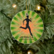 Corrida Executando Ornament Personalizado Natal 20XX. Um corredor se coloca sobre um conselho contra um fundo verde e laranja de explosão de estrelas. Todo texto personalizável, frente e verso!