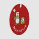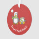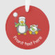 Um pequeno desenho animado de pinguim com bola de neve e um desmaiado. Vestindo lenços verdes e chapéus de Santa.