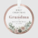 Primeiro Natal como Vó Personalizado com o Nome do Bebê, Data de Nascimento e Foto Ornamento de Acrílico Redondo de Lembrança... Um delicado buquê de rosas cor-de-rosa, pinhas e botânicos da temporada de Natal decora a moldura metálica dourada-rosada que circula o texto na frente do seu presente de Natal para familiares. No verso do ornamento está a foto do neto também emoldurada em dourado-rosado metálico. O texto de exemplo neste ornamento de lembrança diz "Primeiro Natal como Vó de Bethany Westfield 15.05.2025". Todo o texto de exemplo e a foto do espaço reservado podem ser facilmente revisados com os seus na página de personalização.