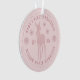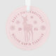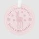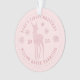 Ornamento moderno rosa bege para o primeiro Natal do bebê personalizável com o nome do bebê, ano, cervo com um laço, flocos de neve e letras curvas em fonte serifa.
