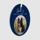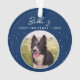 Puppy Primeira Fronteira De Natal, Collie Dog, Ornament Fotográfico. Escrito branco de tendências sobre fundo azul escuro com flocos de neve. Foto personalizada em um quadro redondo. Adicione sua foto de cachorro, nome e ano.