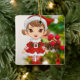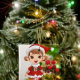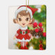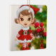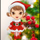 Uma elfo animada e alegre, de cabelo castanho e olhos grandes, vestida com uma roupa vermelha e branca festiva, fica de pé num pano de fundo de uma árvore de Natal decorada. A expressão divertida do elfo e o traje vibrante contrastam com o pinho verde macio!