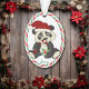 Este é um Enfeites de natal bonito para qualquer criança que ama ursos panda. Um panda preto e branco de olhos largos segura uma cana doce e veste um chapéu de Papai Noel. Abaixo da imagem está o nome especial de sua criança em verde. A imagem é moldada com um padrão bonito vermelho, verde e branco de faixa de canas doce. A parte de trás do ornamento tem o mesmo quadro distribuído e mais campos de texto para personalização. Esta design funciona bem para um menino ou uma menina, e pode ser para um filho, filha, neta ou qualquer criança!