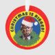 Trump está vestindo um chapéu de Papai Noel e uma coroa e dizendo que o Natal está manipulado nesta divertida design política.