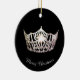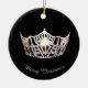 Ornamento decorativo mostrado em preto com uma forma redonda com uma impressão de coroa prateada brilhante e texto de Feliz Natal. Personalize este item ou comprar como está.