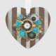 Relógio antigo e patenteado, adornado com joias, mãos de ouro e algarismos latinos com rosa de turquesa sobre fundo castanho e listrado. Estilo Steampunk.