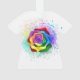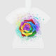 Rosa grande e florescente com pétalas arco-íris sobre fundo branco, pintadas com pedaços de tinta colorida e brilhante. 3d