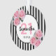 Listras verticais negras e brancas clássicas como fundo. Com rosas rosadas femininas, femininas e românticas como decoração. Um quadro branco e preto na frente com modelo para idade, nome e data. Número de idade 21 em rosa, nome e data em preto. O nome é escrito com um script de estilo manuscrito. Perfeito como presente de aniversário de 21 anos, decoração de festas ou guardar.
