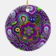 Um ornamento com um design psicadélico colorido com flores abstratas, um coração, e um sinal de paz. É cercada toda por paisley roxo.