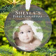 Rústica Wood Baby O Primeiro Ornamento Fotográfico de Natal com ramos de árvores de Natal. O fundo é a madeira rústica escura com flocos de neve e o texto está na moda tipografia branca. Personalize o ornamento com a foto, o nome e o ano de nascimento do seu bebê - insira sua foto favorita. Um excelente de férias.