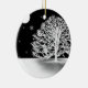 Um design preto e branco simples. Neve branca, árvore branca, flocos de neve brancos e uma lua branca contra um céu do escuro como breu.