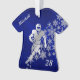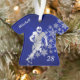 Este ornamento Feriado apresenta um jogador de futebol prateado na frente de um spray de flocos de neve ornamentado prateada. A imagem é colocada sobre um fundo azul profundo gradiente. Seu texto personalizado está em prata na manga esquerda, e um segundo campo está no canto inferior direito. A parte de trás do ornamento tem o mesmo fundo azul e flocos de neve, e campos de texto adicionais para você personalizar. Perfeito para o jogador de futebol ou fã.