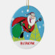 Este adorável ornamento de árvore de Natal em cerâmica apresenta Super Papais noeis vestindo sua capa e carregando um grande saco de presentes e a legenda "Ho! Ho! Ho!"