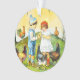 Um ornamento de Páscoa vintage com uma ilustração feita da pintora sueca Jenny Nyström. A ilustração mostra um menino e uma menina com galos, galinhas e galinhas em um campo de primavera. Todo texto no verso é personalizável. A ilustração está no dominio público.