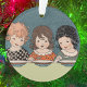 Este ornamento cerâmico redondo tem três irmãs meninas, uma morena, cabelo vermelho, e loira sentada em uma mesa juntos comendo sopa em um fundo azul escuro. Personalize o texto no verso com o modelo.