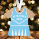 Celebre o espírito da sua chefe de torcida com este enfeite de uniforme de chefe de torcida azul e branco personalizado. Perfeito para comemorar uma temporada especial, equipe ou conquista individual. Personalize com um nome e ano para criar uma lembrança única.
