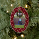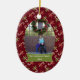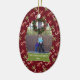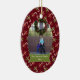 Este ornamento cerâmico dado forma oval do feriado do Natal tem um fundo colorido vermelho com lotes dos bastões de doces brancos, vermelhos, e verdes com arcos toda ao redor no fundo. No meio, você pode personalizar a fotografia da família com seus próprios. Abaixo da foto, há uma bandeira verde e branca onde você possa personalizar o nome e o ano de família. Você poderia personalizar o texto para o primeiro Natal de um bebê ou mesmo nosso primeiro Natal para recentemente um casal!