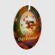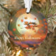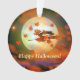 Anseio com minha obra de arte original da silhueta de uma bruxa voando sobre uma lua de cheio assustadora na noite de Halloween, agitando as folhas do outono. O texto personalizável diz "Feliz Dia das Bruxas".
