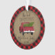 Um caminhão de colheita rústico é carregando árvore de Natal, recentemente cortado da fazenda. Tipografia de estilo country, escrita à mão, sobre fundo kraft, rodeada de xadrez de búfalo vermelha. O pedido é personalizado com o nome e o ano da noiva e do noivo.