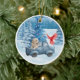 Um Ouro bonito, reprodutor de árvores de natal, Ouro de ornamento cerâmico, um filhote de varejo na picape, sendo observado por um cardeal voador em frente a uma árvore de Natal na floresta