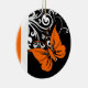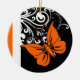 design preto, branco e laranja impressionante - apresentando uma borboleta laranja contra fundo preto com bonito espirais florais brancas.
