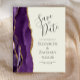 A borda esquerda deste elegante convite de casamento moderno apresenta uma cor d'água roxa, borda agitada, aparada com falso brilho dourado. O texto personalizável combina a escrita manual de cinzas de carvão, as fontes em copperplate e itálico em um fundo de marfim. O verso apresenta um design de agate roxo e dourado correspondente.