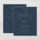 Apresentação do nosso Convite à Apresentação da Tipografia Moderna de Casamento Dourado Azul: Faça uma declaração com os nossos elegantes convites de casamento, com tipografia moderna e sotaques luxuosos de preto e ouro. Criados com muita atenção aos detalhes, esses convites exudem sofisticação e estilo, definindo o tom para seu dia especial. O elegante fundo azul Marinho é enfeitado com um espantoso guião dourado, criando um contraste impressionante que cativa o olho. Personalize os detalhes do seu casamento, desde a data e local até os nomes da noiva e do noivo, para criar um convite personalizado que reflita a sua história de amor única. Quer você esteja planejando um caso urbano chic ou uma família glamourosa, nosso Marinho Blue Dourado Invitation Modern Typografia Script certamente impressiona seus convidados e deixa uma impressão duradoura. Elevem a sua papelaria de casamento com este belo pacote de convite que combina design moderno com elegância eterno.