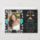 Adicione sua imagem da foto ou do favorito a estes anúncios e convites florais preto e branco elegantes e formais da graduação da escola de direito do damasco com as escalas de um ouro do design de justiça e do design costurado impresso do olhar da fita do aqua de turquesa azul brilhante. Personalize-o para dizer o que quer que você quer no traseiro e dianteiro dos anúncios e dos convites da graduação do formando do advogado. © Chrissy H. Estúdio dos trabalhos de arte, LLC. Todos os direitos reservados.