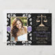 Adicione sua imagem da foto ou do favorito a estes anúncios e convites florais preto e branco elegantes e formais da graduação da escola de direito do damasco com as escalas de um ouro do design de justiça e do design costurado roxo impresso do olhar da fita. Personalize-o para dizer o que quer que você quer no traseiro e dianteiro dos anúncios e dos convites da graduação do formando do advogado. © Chrissy H. Estúdio dos trabalhos de arte, LLC. Todos os direitos reservados.