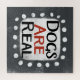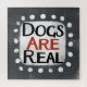 "Cachorros são reais" é um design de texto bonito em cinzas com texto preto e vermelho, junto com forma de sotaque branco e pontos brancos texturizados ao seu redor.