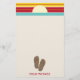 70s inspirou os artigos de papelaria temáticos da praia que caracterizam uma ilustração de um par de chinelos marrons no fundo. Personalize com seu nome sob chinelos. Design do por do sol das características amarelo vermelho e azul da parte superior.
