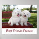 Dois pequenos e bonitos cachorros brancos frisam cachorros felizes sorrindo, sentados juntos num banco de parque com texto "Melhores Amigos para Sempre". Fácil de personalizar e alterar o texto e a fonte, ou deixá-la fora se quiser. Um presente perfeito para aquele bff especial! Excelente para o amante de os animais!