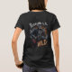 Uma mulher modela uma camiseta preta com um gráfico de rock-and-roll de um esqueleto tocando uma guitarra elétrica, cercada por chamas e fumaça, com o texto "Bone to be Wild".