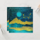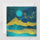 design de paisagem da montanha abstrato em tons de ouro, ciano e azul em tons negros, com um nascer, estrelas e pássaros.