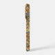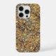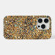 Capa de telefone brilhante ouro brilhante com partes vítreas coloridas aspergidas sobre fundo preto.