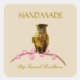 Ouro coruja adesivo feito à mão. A coruja ouro está em um galho florescente em fundo bege. O texto está pronto para ser personalizado.