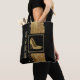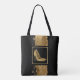 Chic com o saco de traços de propósito feito em preto, com gráficos de brilho de ouro e traçados de tinta dourada. Uma área preta quadrada decorativa, no meio da bolsa, tem um belo par de saltos altos de ouro. Ouro que o texto lê, Faça com que os calçados viagem e possam ser personalizados para ler o que você quer.