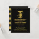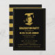 Um convite da festa de formatura no ouro e no preto do falso. Tem uma silhueta do esboço de uma menina que veste um chapéu graduado do almofariz com seu cabelo amarrado em uma cauda de pônei. No reverso são as listras horizontais desiguais. Personalize com seus detalhes da festa de formatura.
