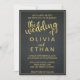 Esta elegante caligrafia negra e dourada, tudo num convite de casamento, é perfeita para um casamento moderno. A design romântica minimalista apresenta uma magnífica e elegante tipografia negra e dourada em um fundo rústico e chico.